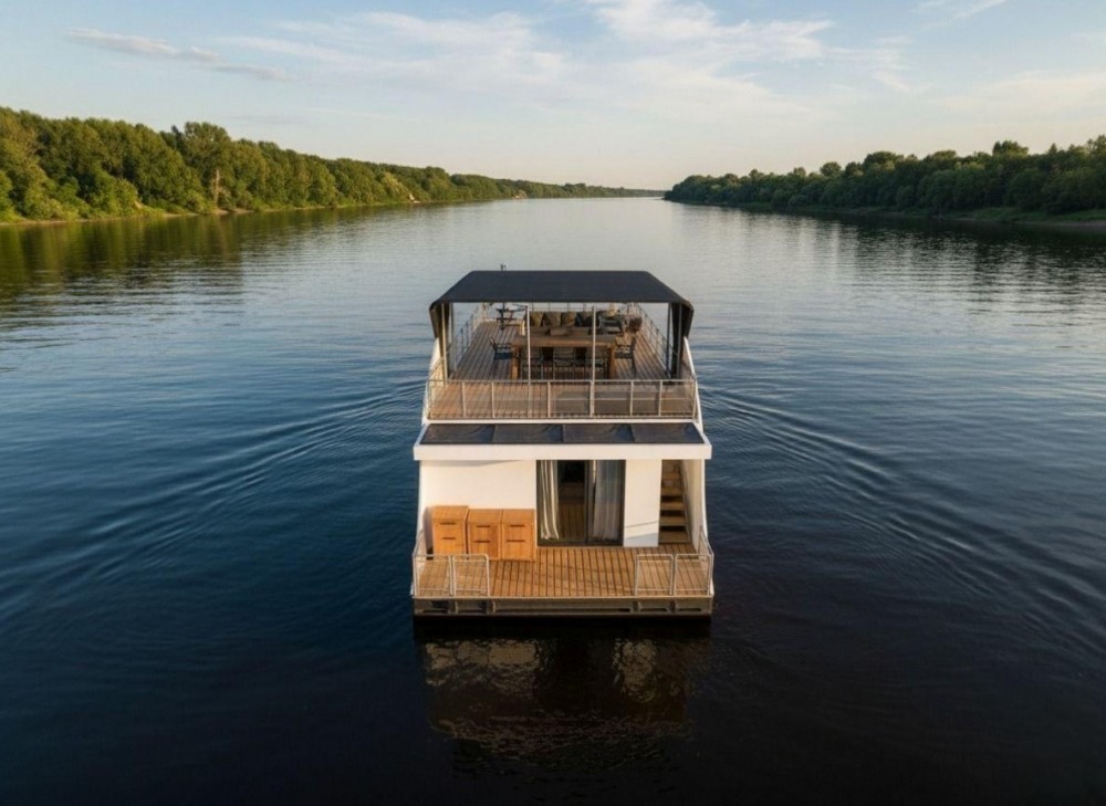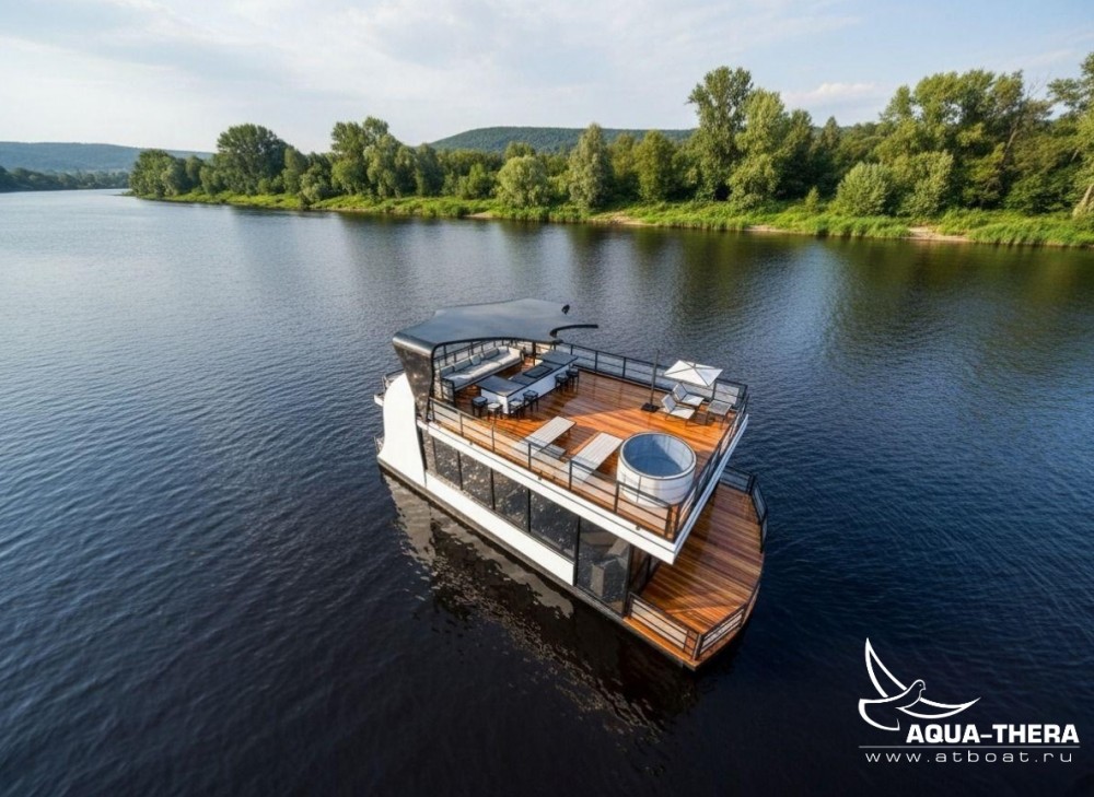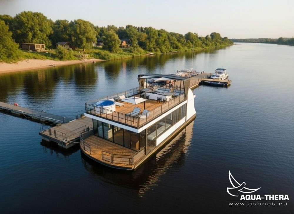 Плавдом (хаусбот) Скат разработан для комфортного круглогодичного отдыха семьи 4-6 человек. С максимально большим объемом закрытого пространства первого этажа. Чтобы холодное время года, дождливая или пасмурная погода не помешали уютному времяпровождению. Большое пространство верхней палубы даст возможность насладиться солнцем, а навес при необходимости укроет от дождя или создаст приятную тень от солнца.