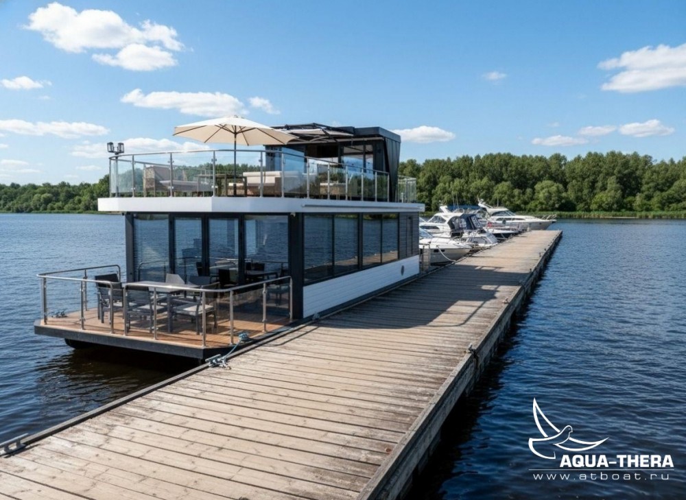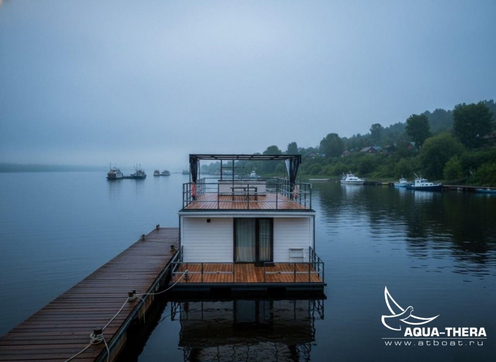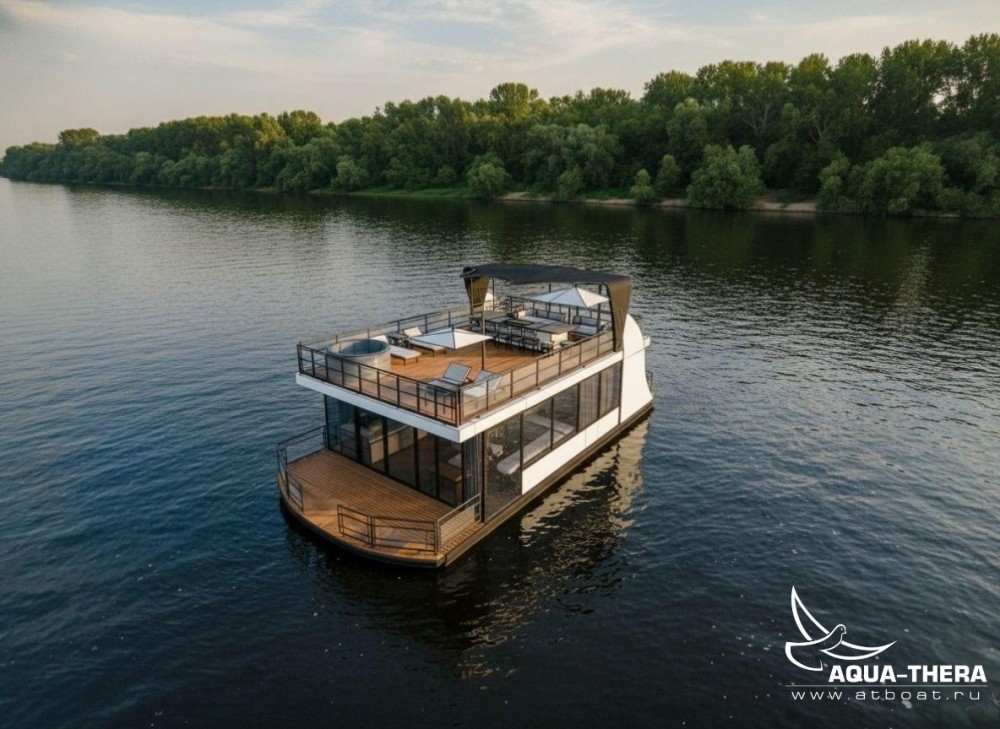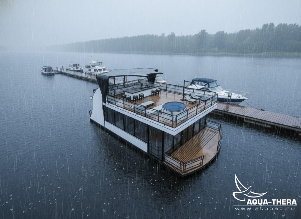 Плавдом (хаусбот) Скат разработан для комфортного круглогодичного отдыха семьи 4-6 человек. С максимально большим объемом закрытого пространства первого этажа. Чтобы холодное время года, дождливая или пасмурная погода не помешали уютному времяпровождению. Большое пространство верхней палубы даст возможность насладиться солнцем, а навес при необходимости укроет от дождя или создаст приятную тень от солнца.